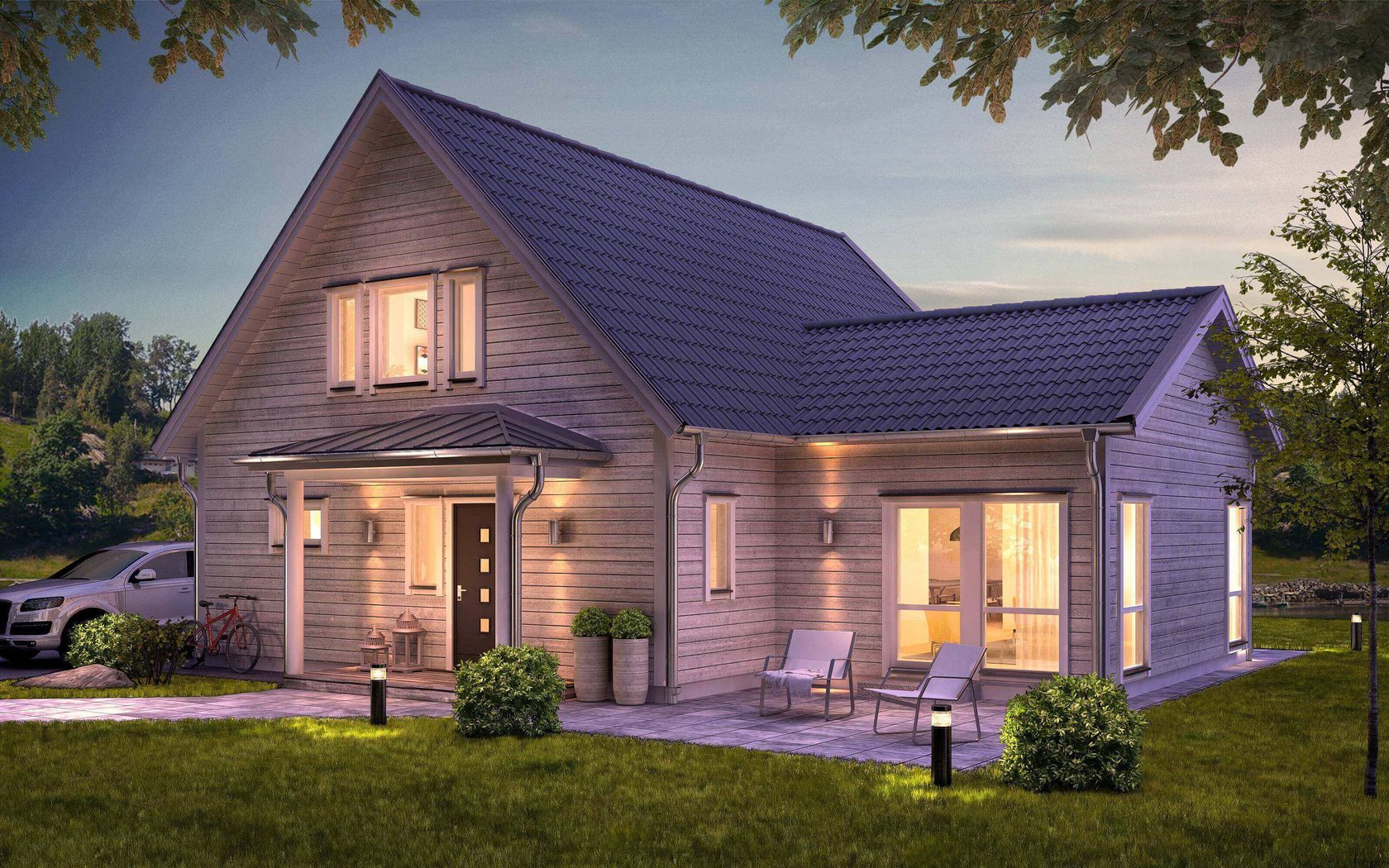 Дом построен! Осталось самое приятное — создать уютный интерьер. Мы облицовываем фасад, красим стены, закупаем мебель, монтируем окна, двери, лестницы и водосточные системы. В общем, доводим проект до того вида, в котором он был утвержден на этапе визуализации.